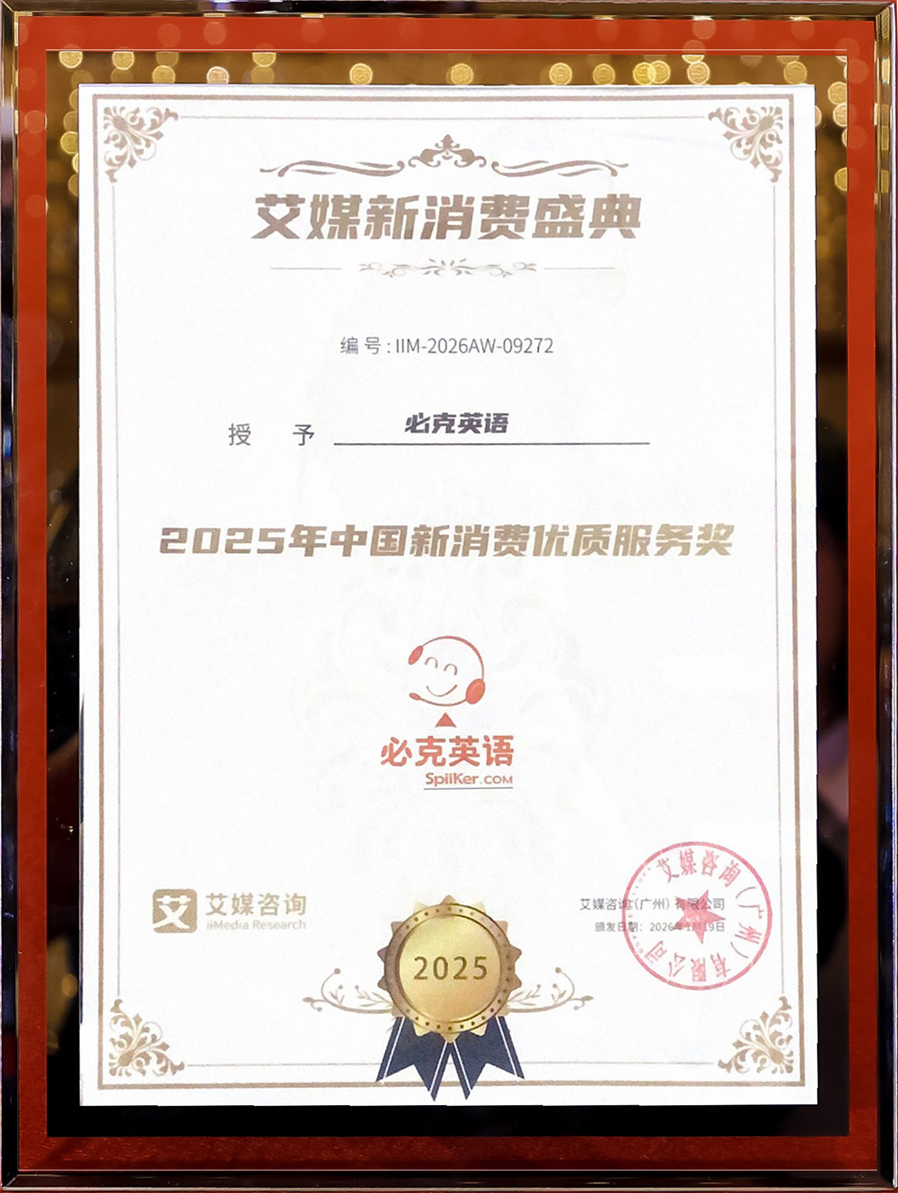 2026年1月,必克英语获得年度中国新消费优质服务奖
